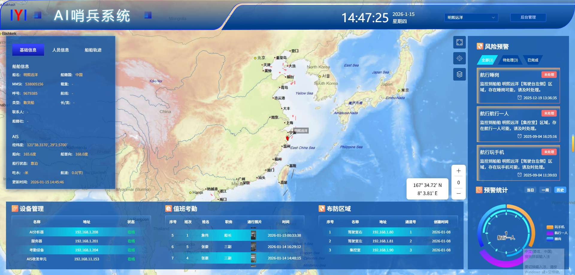 随着国内海事机关落实《船舶智能监控技术指南1.0》和《岸基值班、航次安全风险评估、高风险作业船舶双把关》要求,市场不断地涌现不同产品,特结合我司服务体系与产业结构,深受鼓舞及启发,继2022年公司推出值班瞭望1.0以来,隆重推出外贸版“船舶AI哨兵2.0值班系统”。该系统深度融合人工智能、多传感器融合为全球航运业提供新一代的数字化、智能化瞭望解决方案,标志着我司服务领域进入“智能感知”新阶段。